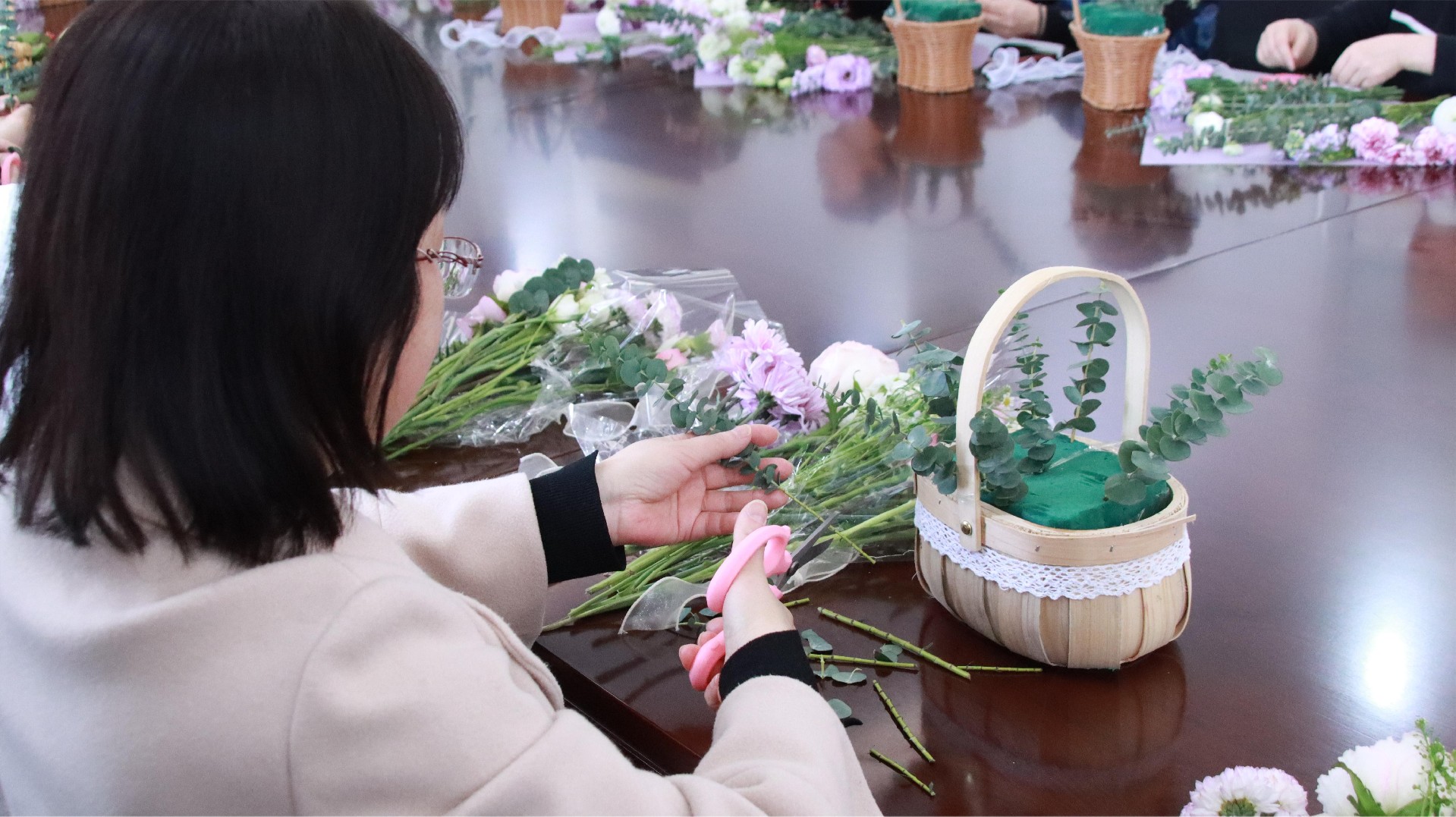 活動邀請專業(yè)花藝師給大家講授插花知識,講師從花材選擇、養(yǎng)護(hù)技巧、花籃造型、花型搭配等方面,向在場“女神們”詳細(xì)介紹了插花藝術(shù)的要素與技巧。
